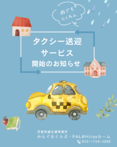 こんにちは。 このたび、10月より「タクシー送迎サービス」を開始することとなりました。みんぐるくらぶのスタッフが添乗し、安全に配慮して送迎いたします。 送迎は、園またはご自宅からの発着に対応しております。費用につきまして […]