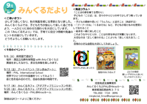 みんぐるくらぶ・PAL@Hirooルームでは、9月も親子で楽しめるイベントをたくさんご用意しています。五感を使った遊びやアート体験、多文化交流など、保育園や地域の仲間と一緒に楽しく過ごしませんか?お気軽にご参加ください! […]