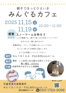 児童発達支援事業所 みんぐるくらぶ・PAL@Hirooルーム では、親子で楽しく過ごせる交流イベント「みんぐるカフェ」を開催します。 今回のテーマ:感覚あそび「スノードームを作ろう」 お子さんと一緒に遊びながら、保護者同 […]