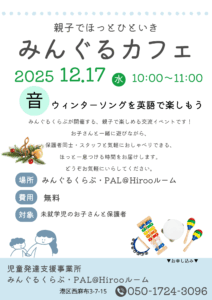 児童発達支援事業所 みんぐるくらぶ・PAL@Hirooルーム では、親子で楽しく過ごせる交流イベント「みんぐるカフェ」を開催します。 今回のテーマ:感覚あそび「スノードームを作ろう」 お子さんと一緒に遊びながら、保護者同 […]