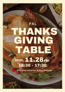 ご家族の皆さま、そして地域の皆さまへ。日頃より本校の活動にご理解とご協力をいただき、誠にありがとうございます。 11月28日(金)に PAL Thanksgiving Table を開催いたします。当日は、PALで心を込 […]